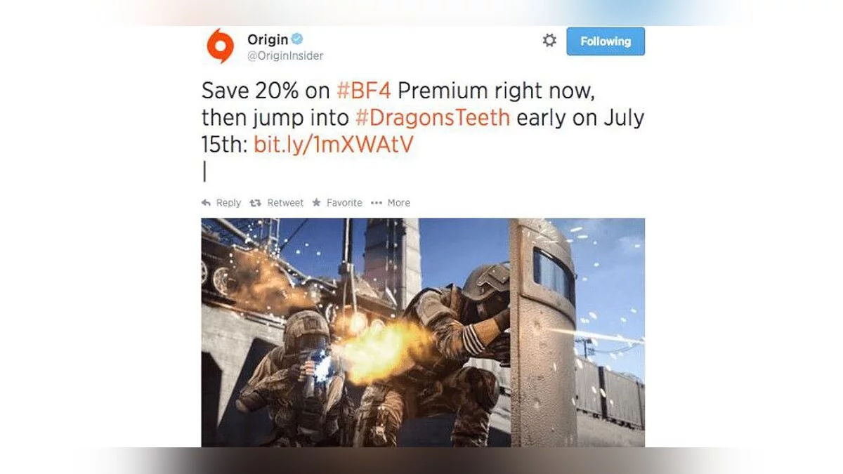 Twitter-аккаунт Origin засветил дату выхода загружаемого дополнения Battlefield 4: Dragon's Teeth, когда сообщил, что на Battlefield Premium действует скидка в 20%.
