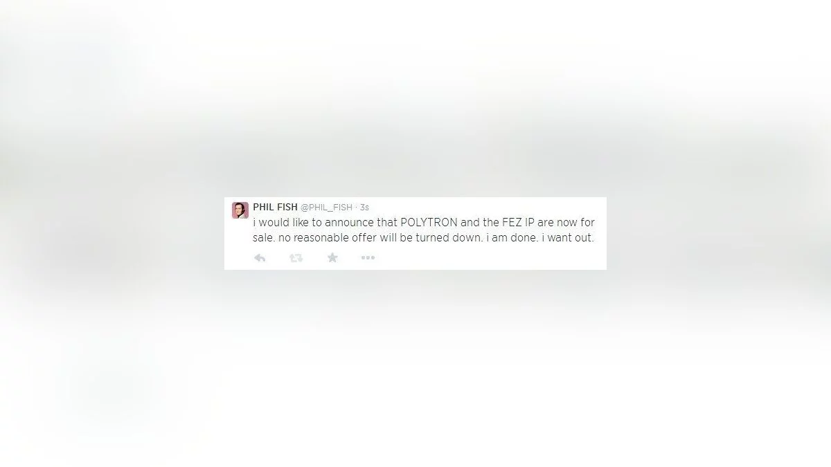 «Хочу сообщить, что Polytron и Fez ищут нового владельца. Соглашусь на любое разумное предложение о покупке. Я устал и ухожу. Хочу, чтобы остальные разработчики не сдавались», — сообщил геймдизайнер незадолго до удаления Twitter.