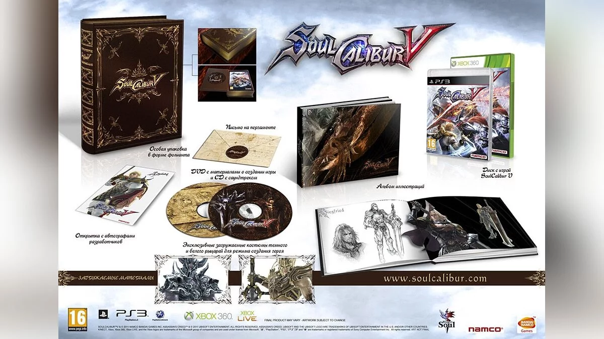 Оформив предварительный заказ, вы получите эксклюзивного дополнительного бойца Дампьера из SoulCalibur: Broken Destiny для PSP. Вам этого мало? Тогда обратите свой взор на Коллекционное издание SoulCalibur 5, в которое входит: