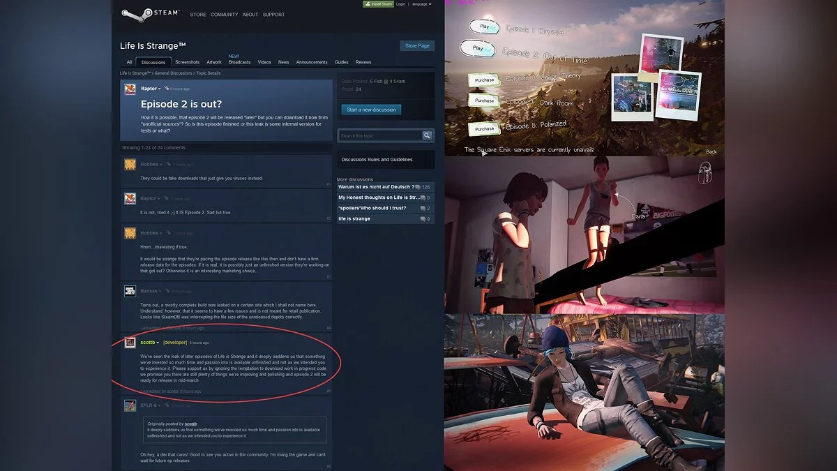 Представитель Dontnod под ником scottb выразил глубочайшие соболезнования от лица студии за то, что поклонники получили доступ к незаконченной и не предназначавшейся для игры версии Life is Strange, и попросил поддержать разработчиков и удержаться от соблазна скачать ранний билд. По словам scottb, слитая игра далека от совершенства, и Dontnod предстоит ещё много доделать, изменить и внедрить.