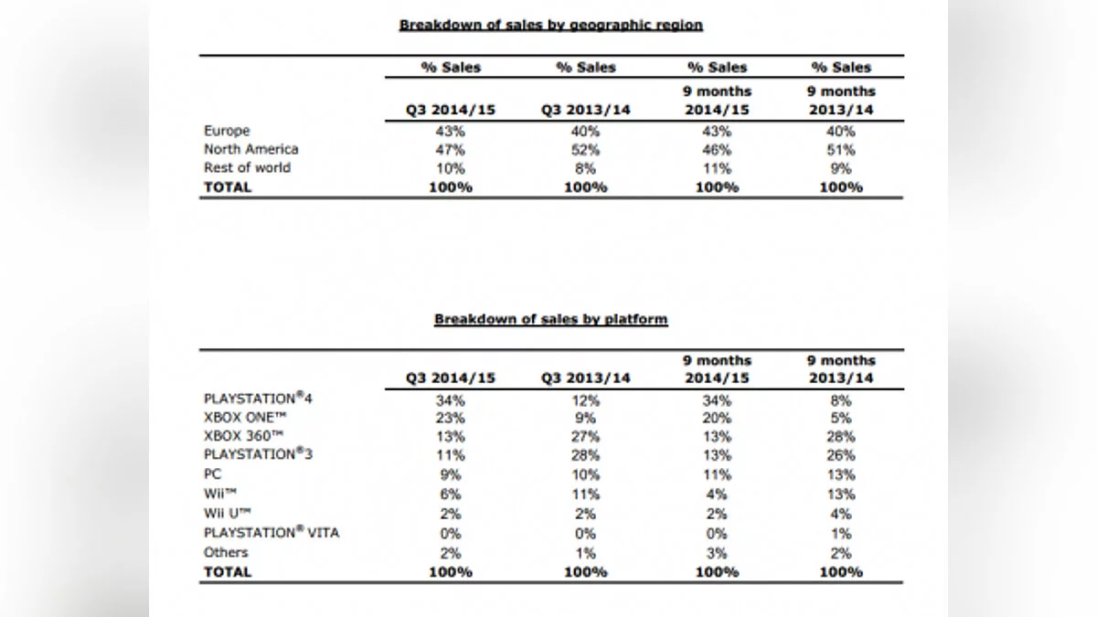 Финансовое благополучие в размере 730 млн. евро Ubisoft принесли такие громкие игры, как Assassin's Creed: Unity, Child of Light, Far Cry 4, Just Dance 2015, Crew, Trials Fusion и Frontier, Valiant Hearts и Watch Dogs.