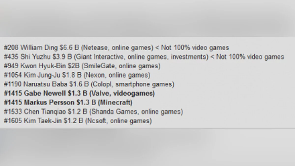 Гейб Ньюэлл и Маркус Перссон разделили позицию в списке богатейших людей мира