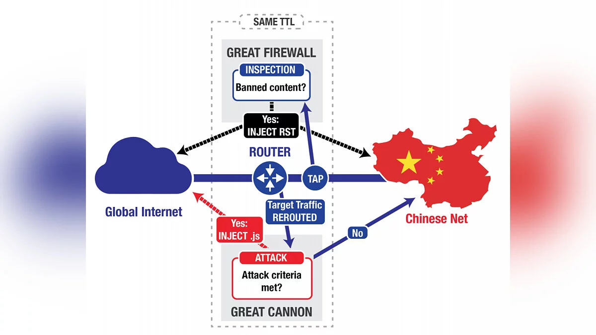 Принцип работы китайской системы выглядит следующим образом: она способна перехватывать трафик, идущий к поисковой системе Baidu, и в ответном трафике включает вредоносные скрипты, которые перенаправляются на неугодные сайты. Исследователи приписывают этой разработке ответственность за падения Github и GreatFire — ресурсов, которые, помимо всего прочего, содержат информацию по способам обхода «Великого файрвола».
