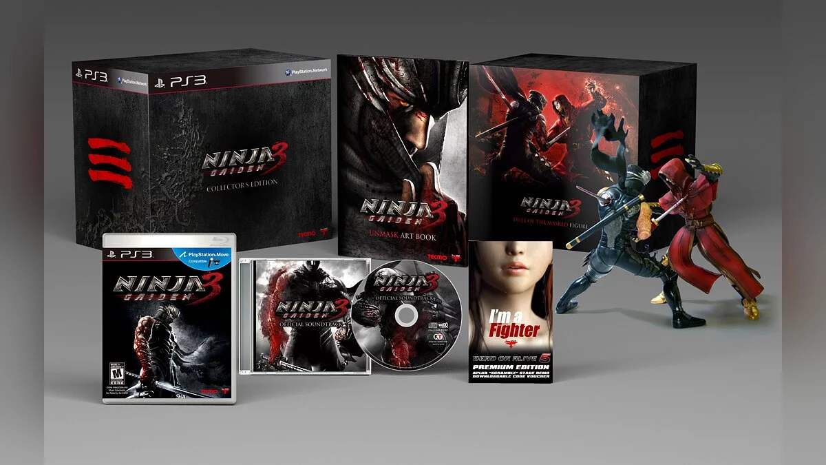 Кроме самой игры, в Ninja Gaiden 3 Collector’s Edition войдёт демка Dead or Alive 5, книга с артом, диск с саундтреком и фигурка Duel of the Mask стоимостью $99. Коллекционное издание выйдет как для PS3, так и для Xbox 360. Ниже размещено изображение комплектации коллекционного издания.