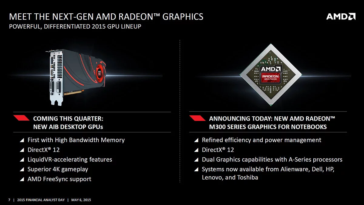 Второй дебют оказался двойным: была официально представлена линейка мобильных видеокарт Radeon R серии M300 с полной поддержкой DirectX 12, улучшенным быстродействием, сниженным энергопотреблением и полной совместимостью с APU, а уже в этом квартале состоится премьера настольной видеокарты 300 серии. Речь идёт, конечно же, о Fiji. Готовые решения на базе Radeon R M300 уже представили Alienware, Dell, HP, Lenovo и Toshiba, ищите, как говорится, в магазинах. Что касается «взрослых» видеокарт, то у них появятся те же возможности плюс наличие памяти HBM, поддержки AMD FreeSync и ускорения LiquidVR, подробнее о котором читайте в тематической статейке выше.