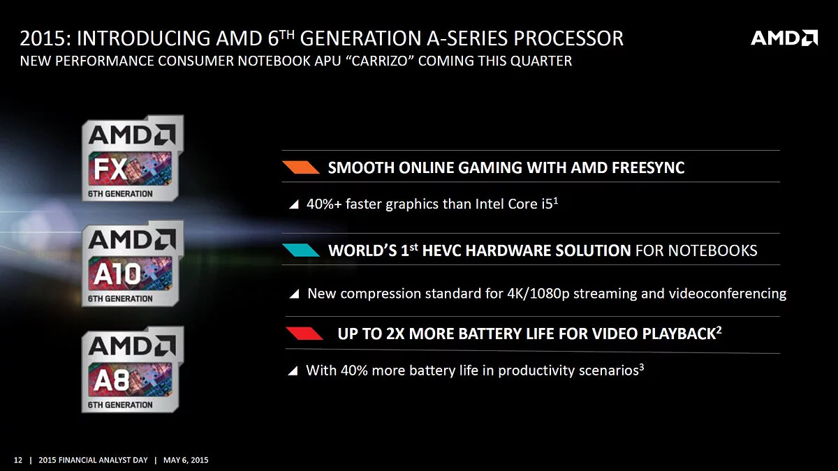 Кстати о птичках. Согласно показанному Лизой Су слайду, в течение этого и следующего кварталов должно состояться сразу несколько горячих релизов, и первый из них — высокопроизводительные APU Carrizo, которые нагрянут в сферу ноутбуков уже летом и дадут бой 14-нанометровым Broadwell и Skylake от Intel.