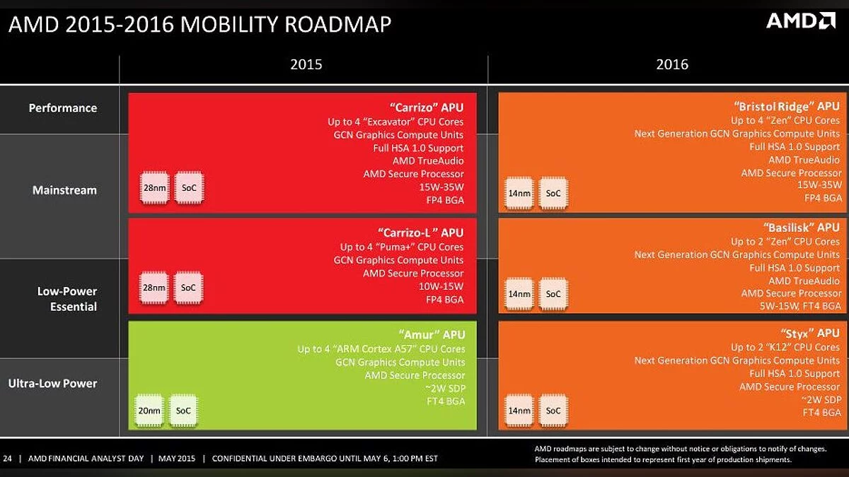 Что же касается мобильного сегмента, то Carrizo и Carrizo-L, о которых чуть ниже, сменят те же Bristol Ridge и Basilisk, а вот на смену APU с ультра-низким энергопотреблением Amur на архитектуре ARM Cortex A57 придут Styx на архитектуре AMD K12. Все четыре преемника будут разработаны на 14-нанометровом техпроцессе.