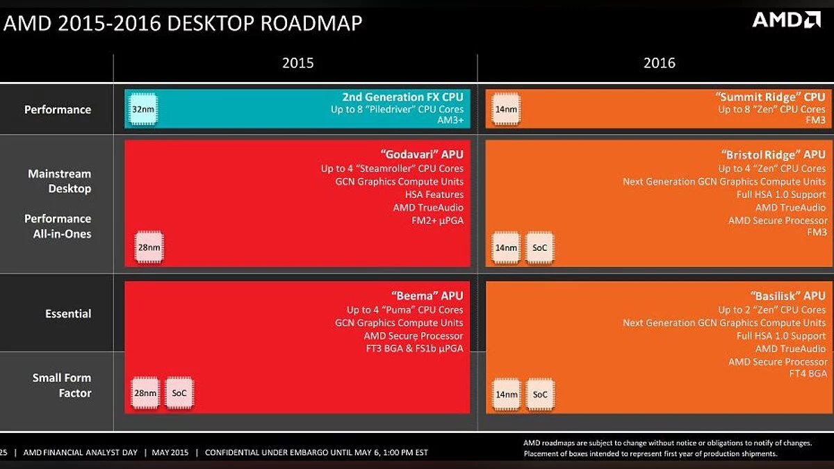 Дебют первенцев на Zen состоится уже в 2016 году. Настольные CPU предполагаемо сменят названия с FX на Summit Ridge и заимеют до восьми ядер и исполнение FM3; гибридные Godavari на ядрах Steamroller, которые AMD представит уже в конце мая, сменятся Bristol Ridge с поддержкой TrueAudio и HSA 1.0, ядрами GCN нового поколения и тем же исполнением FM3; ну и SoC-чипы Beema на ядрах Puma уступят место Basilisk с двумя Zen-ядрами и исполнением FT4 (то есть они будут распаиваться на матплаты моноблоков и систем малого форм-фактора).