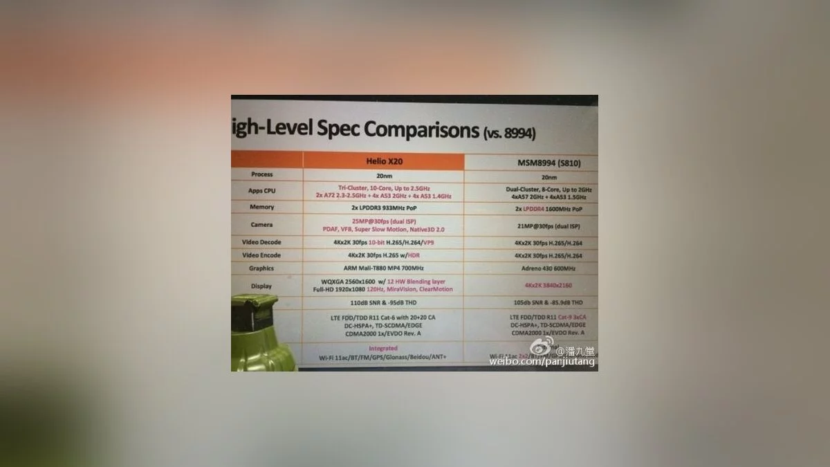 Впрочем, слух позже подтвердился. Десятиядерной детиной станет MT6797 — выходец из новоиспечённой линейки Helio с обозначением X20. Как и предполагалось, компоновка его ядер будет построена по принципу «4+4+2», где первые четыре ядра Cortex-A53 на частоте 1,4 ГГц будут активны всегда, ещё четыре на частоте 2,0 ГГц смогут приходить им на помощь, а обеспечить максимальное быстродействие призваны два ядра Cortex-A72, функционирующих на 2,5 ГГц. Разогнанный до 700 МГц графический чип Mali-T880 MP4 позволит с комфортом наслаждаться требовательными играми и снимать 3D-фото.