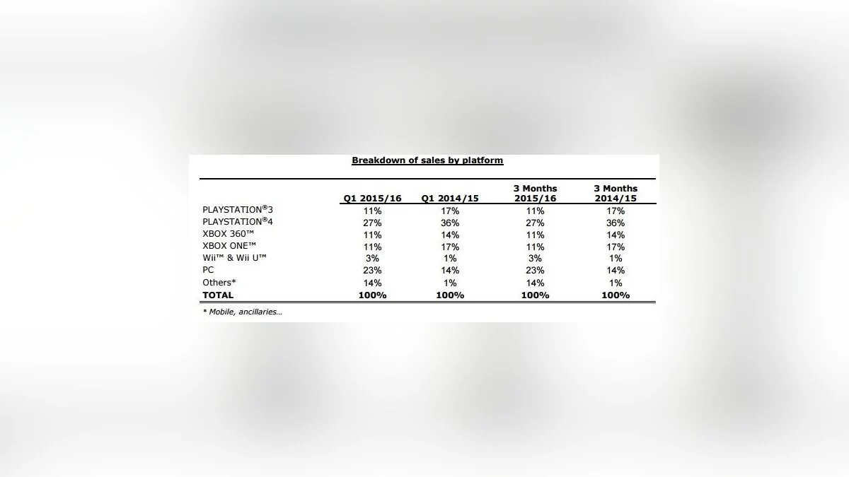 Заметно упала доля продаж с консолей прошлого поколения с 34 % (суммарно) до 22 % (суммарно). Те же 11 % и у Xbox One — низкий спрос обосновывается проблемами Microsoft с данной консолью. Ubisoft не остается ничего другого, как ждать, когда же Xbox One сможет догнать PS4.
