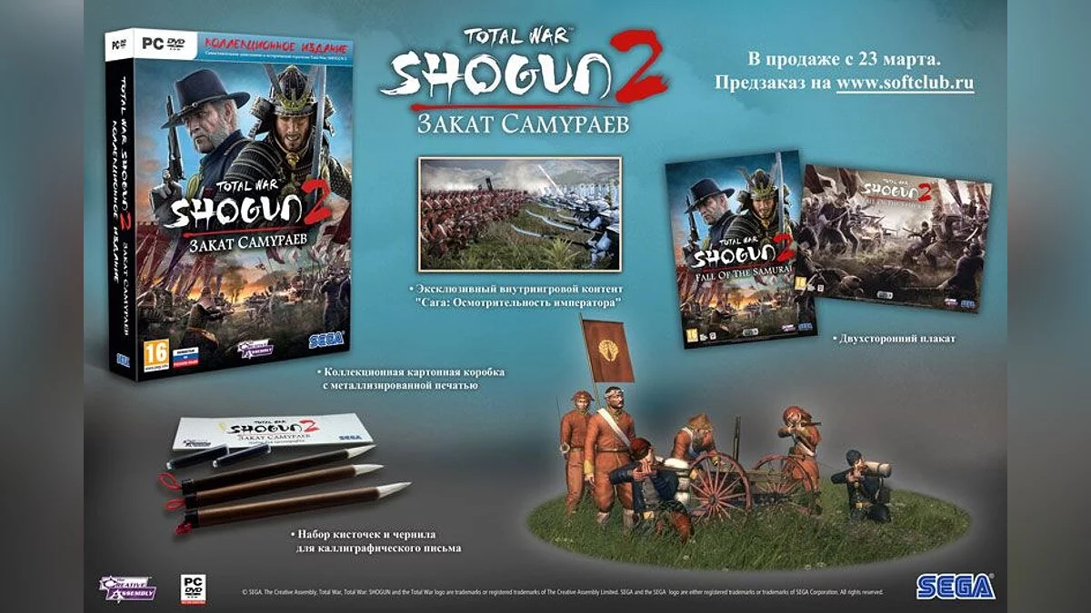 Успеть надо до 23:59 15 марта. Выполнив эту несложную процедуру, вы гарантированно получите свою копию коллекционного издания сразу после выхода игры 23 марта. Кстати, отечественная версия "Total War: SHOGUN 2 – Закат самураев" поступит в продажу полностью на русском языке и по цене 799 рублей.