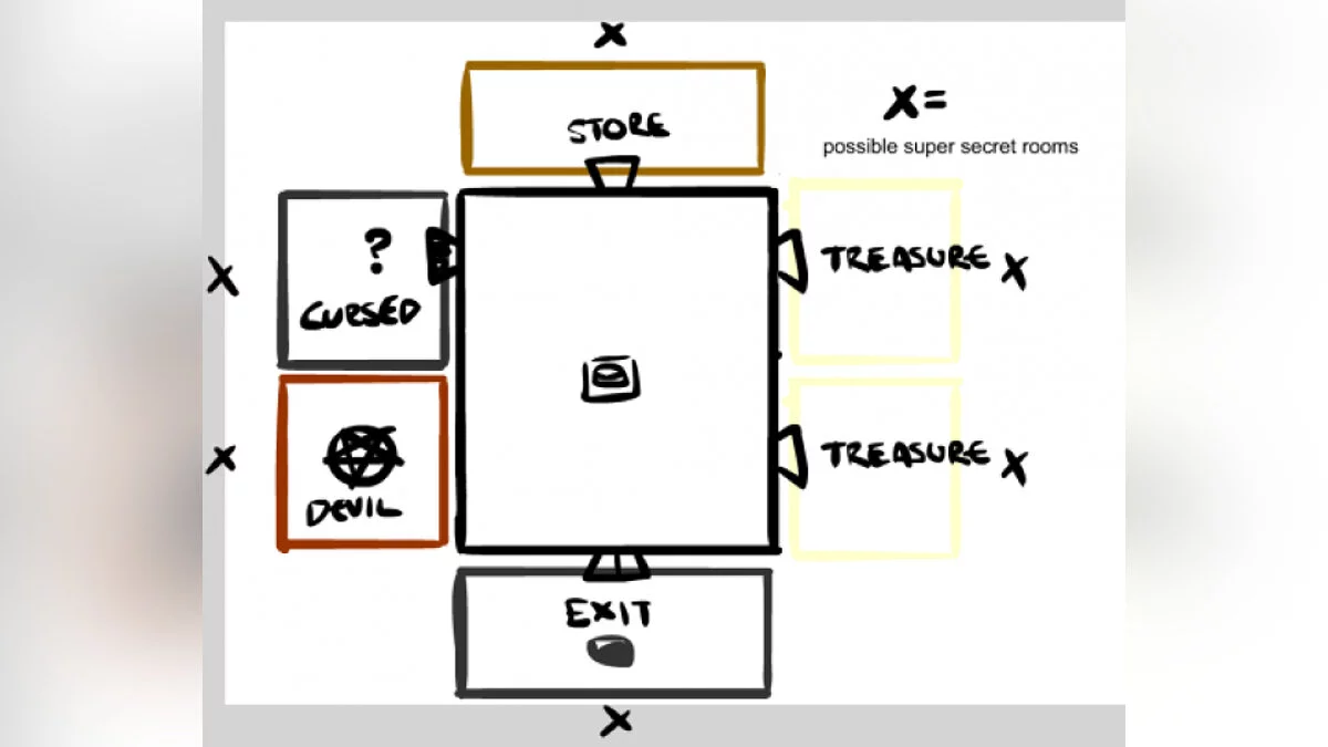 Структура каждого этажа выглядит так. Вдвое более широкий магазин, две сокровищницы, проклятая комната, выход. Также существует шанс, что появится комната ангела/демона. Но основной фокус сделан на широкой комнате с кнопкой в центре.