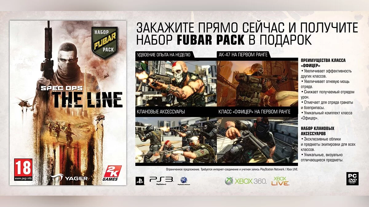 Увлекательную сюжетную кампанию Spec Ops: The Line дополняют разнообразные сетевые режимы, среди которых найдутся как классические варианты, так и уникальные модификации, связанные с развитием основного сюжета. Вы сможете выбрать одну из двух сторон конфликта, персонифицировать своего героя и настроить его под собственный стиль игры.