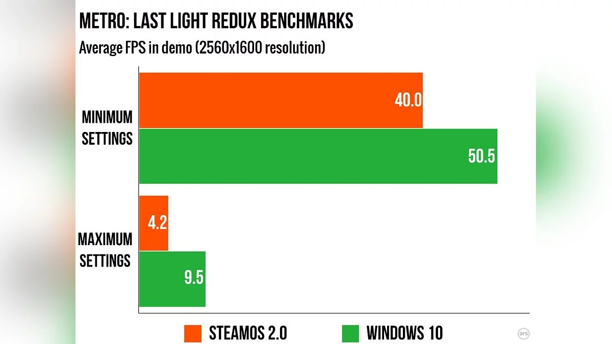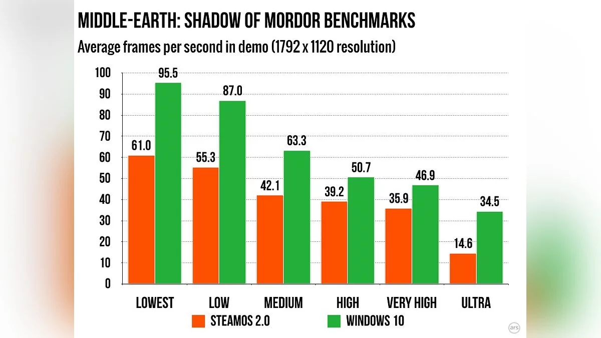 Тесты выявили безусловное превосходство Windows 10, особенно в операциях с плавающей точкой. Middle-Earth: Shadow of Mordor и Metro: Last Light Redux на ультра-настройках в HD-разрешении на Windows 10 демонстрировали в среднем 34,5 fps, тогда как на SteamOS было всего 14,6 fps.