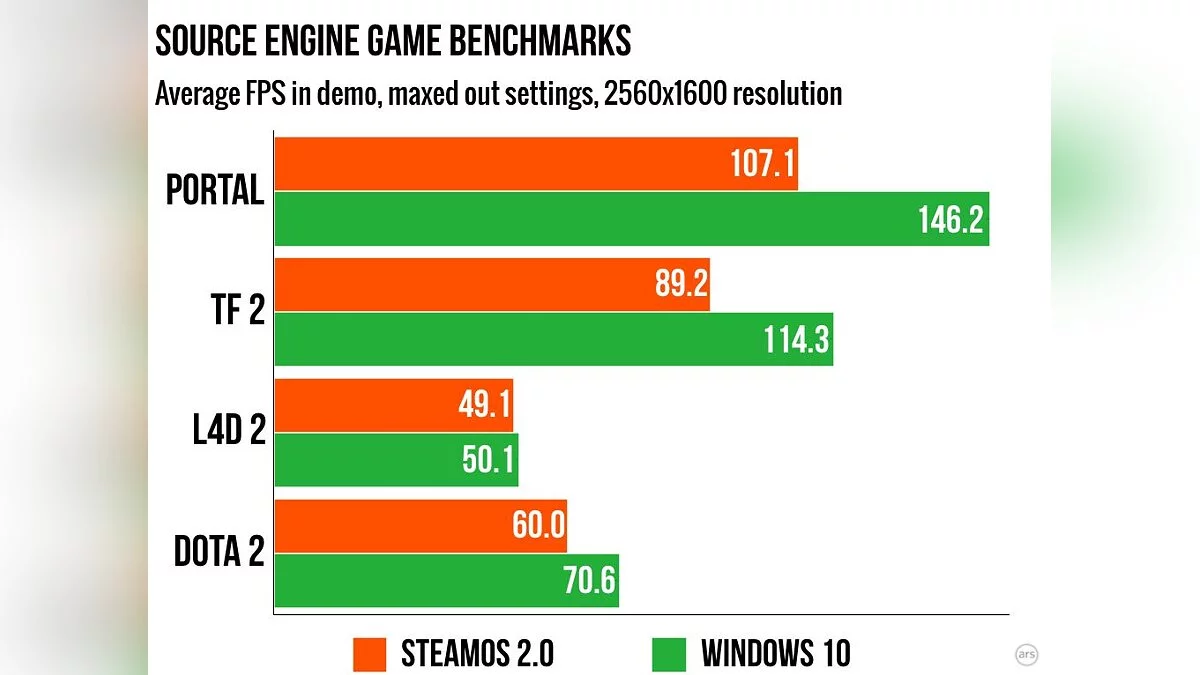 Ars Technica предположила, что уважаемые в индустрии разработчики просто не смогли раскрыть потенциал OpenGL, перенося игры в среду Linux. И обратилась к проектам на Source Engine, разработанным самой Valve. Увы, но результаты не изменились. Portal, Team Fortress 2, DOTA 2 выдали на Windows 10 на один-несколько десятков кадров больше, только Left 4 Dead 2 показала одинаковую производительность на обеих системах. Это всё. Никакого прироста fps, как обещала Valve, не было.