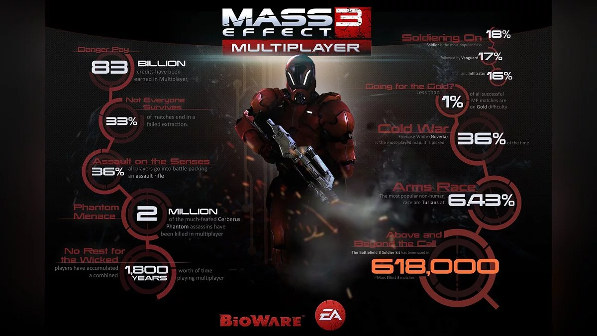 Никогда не задумывались вопросом, сколько человек играет в мультиплеер Mass Effect 3? Или сколько очков они заработали? Какой самый популярный класс? У BioWare есть ответ на все эти вопросы.