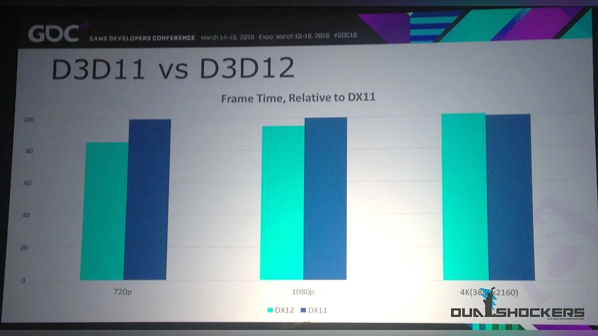 - Разработчики показали две диаграммы (ниже), в которых демонстрируется, так ли DirectX 12 выгоден по сравнению с DirectX 11. Разработчики использовали две разные видеокарты, не уточнив модели. Первая продемонстрировала 20%-ный прирост на 720p и небольшое падение на 4K. Вторая на 30% лучше в 720p и на 10% лучше в 4K;