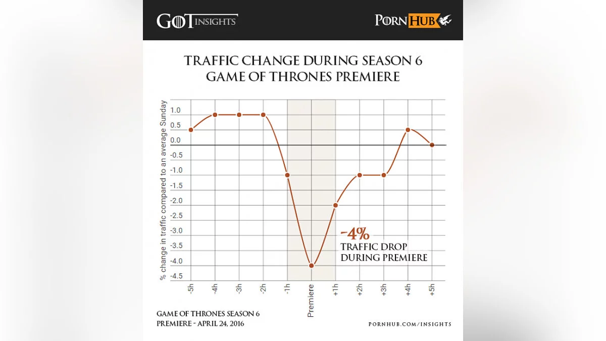 На графике можно видеть, что около 4 % пользователей Pornhub отказалось от вечернего времяпровождения в день премьеры нового сезона. Это весомое число, потому что каждый день на сайт заходит больше 60 миллионов человек. На совпадение это никак не тянет, 24 апреля люди вбивали «Игру Престолов» в поисковую строчку на 270 % активнее, чем обычно.