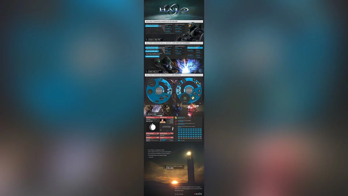 На протяжении восьми лет работы серверов, в играх Halo было проведено более двадцати миллионов матчей, а общее время игры всех геймеров составляет свыше 235 тысяч лет.