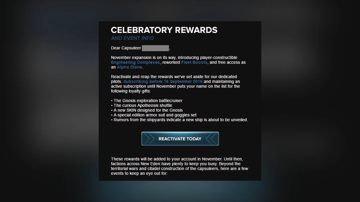 Студия недавно разослала е-мейл извещения, где объявила, что игроки, подписавшиеся до 16 сентября — и которые продержатся до ноябрьского патча, — получат бэттлкрузер, шаттл, специальные скины, специальное оружие и гогглы. И даже, может быть, еще один новый корабль. Все это просто прекрасно — особенно гогглы.