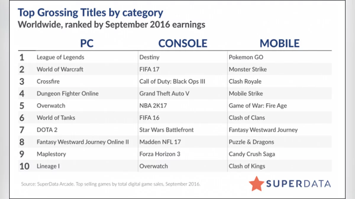 Аналитическая компания Superdata представила отчет по рынку видеоигр за сентябрь. Destiny снова возглавила десятку игр, которые больше всех зарабатывают.