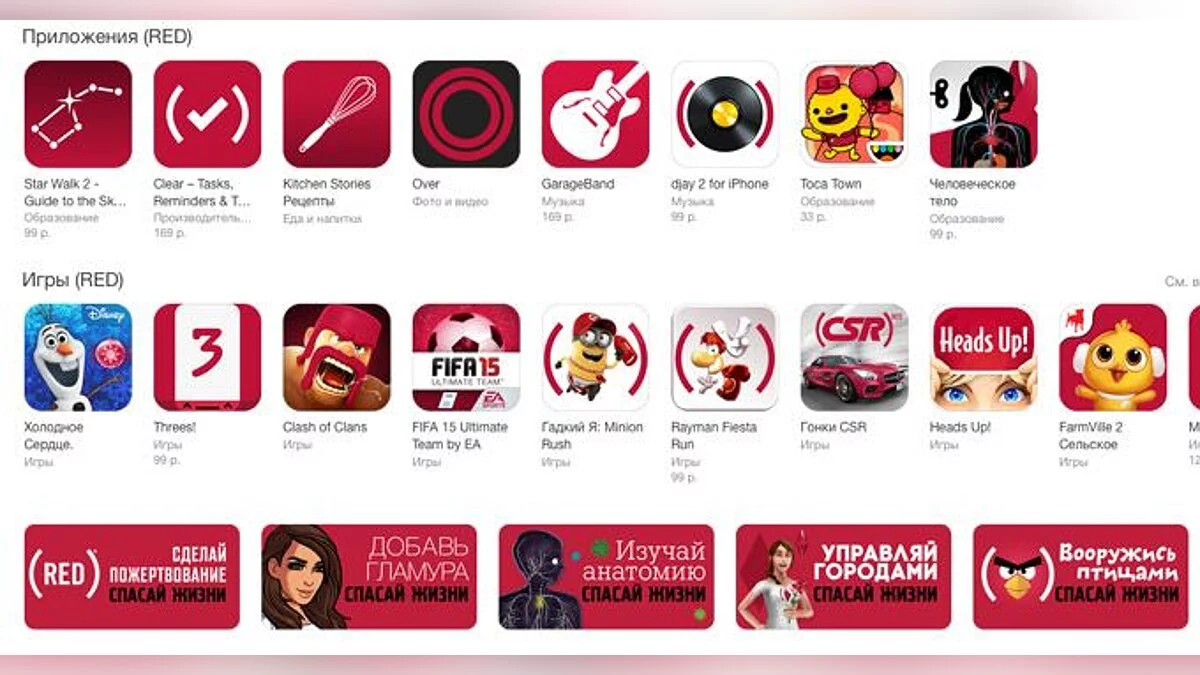 Магазин содержит специальный раздел «Приложения (RED)». Игры и программы, размещенные в нем, представляют пользователям уникальный контент. Все средства, полученные этими приложениями, будут направлены в фонд RED.