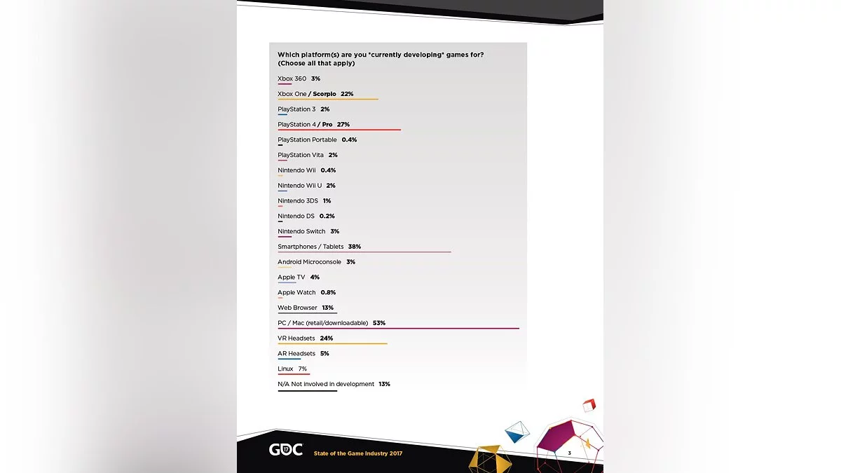 По данным опроса GDC 2017, PC-платформа является наиболее популярной среди всех остальных. В опросе приняли участие около 45 000 разработчиков, которые посетили выставку GDC в течение последних трех лет. Если верить результатам опроса, то 53 % из всех разработчиков выбрали PC, как основную игровую платформу.