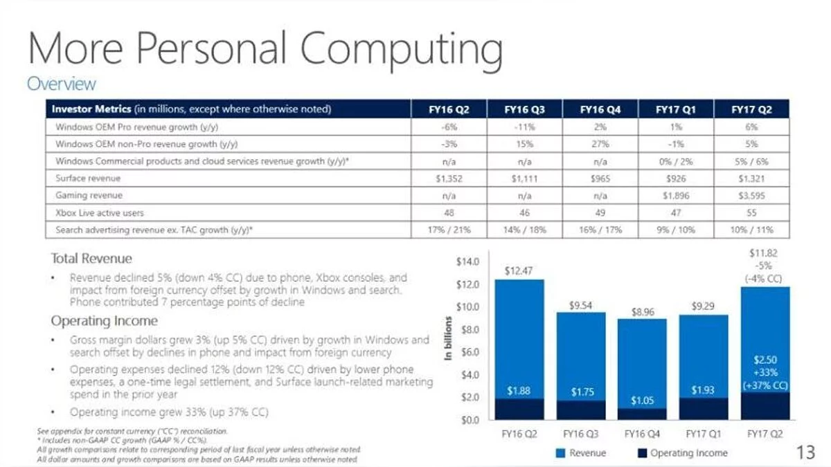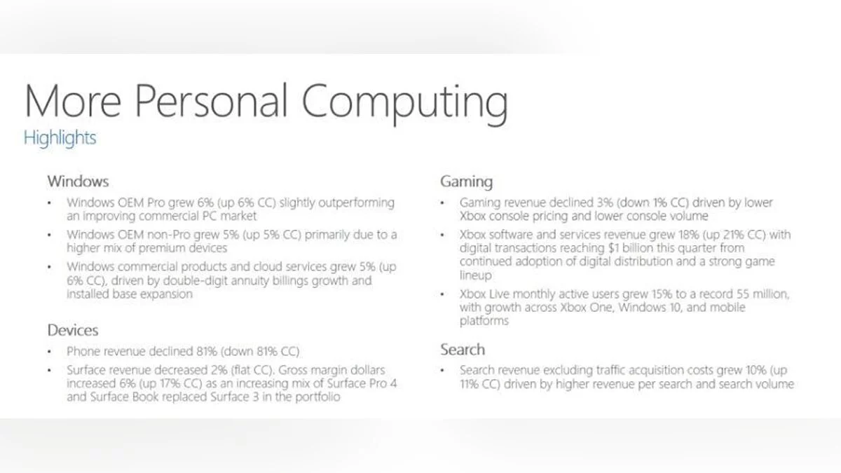 Игровой доход снизился на 3 % в годовом исчислении из-за снижения прибыли с консолей Xbox, вызванное более низкой ценовой политикой. Потери были частично компенсированы высокими показателями в продаже услуг и программного обеспечения. Доход в этом сегменте вырос на 18 % с цифровых покупок, достигающих один миллиард долларов в течение квартала.