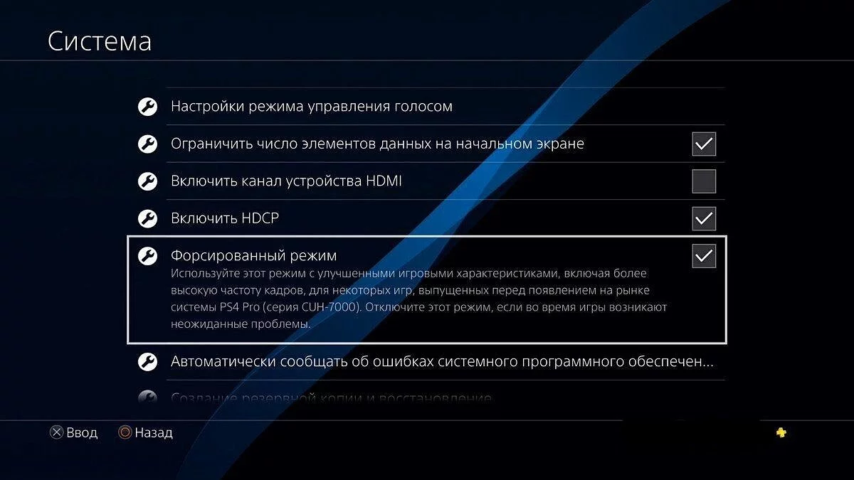 В меню на PlayStation 4 Pro появляется загадочный пункт «Форсированный режим». "Используйте этот режим с улучшенными игровыми характеристиками, включая высокую частоту кадров, для некоторых игр, выпущенных до появления на рынке PS4 Pro". Как оказалось, этот режим кроме количества числа кадров в секунду ничего не меняет, но и здесь разница с классической PS4 получилась огромной — 110 кадров против 60, по крайней мере в Rainbow Six Siege. Судя по другим сообщениям, с остальными играми вырисовывается примерно такая же ситуация. Но это касается только тех проектов, для которых поддержка PS4 Pro официально не заявлена.