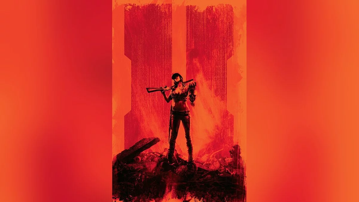 Black Ops 2. На постере изображена девушка с дробовиком, возвышающаяся