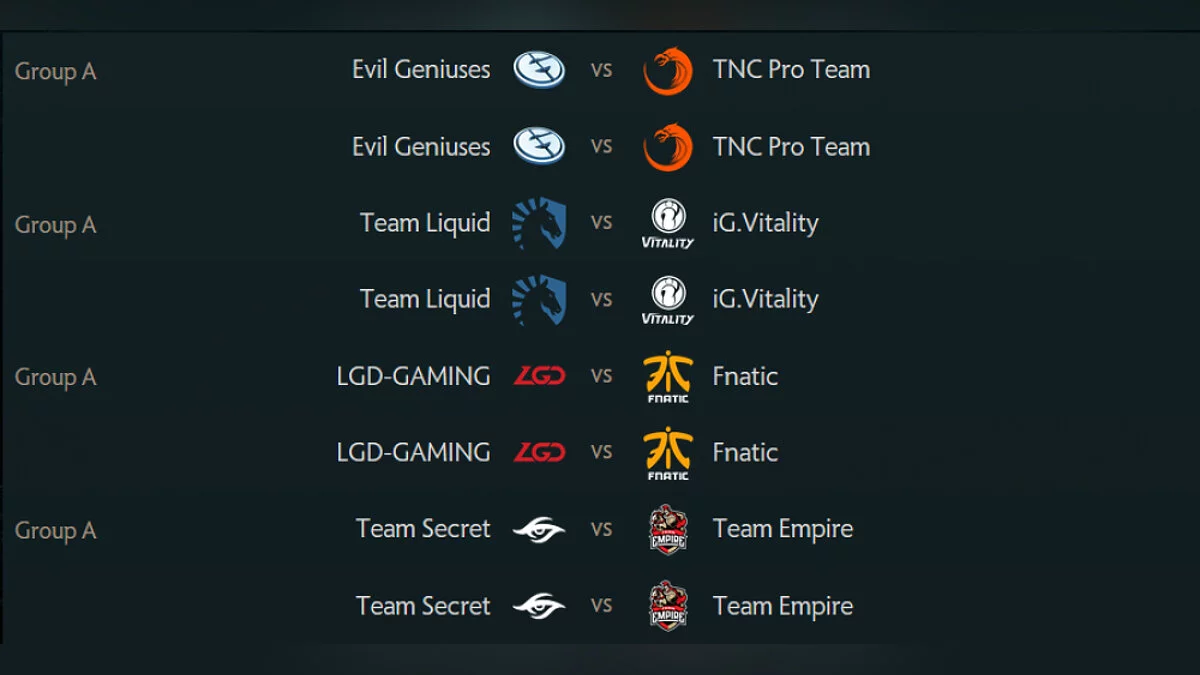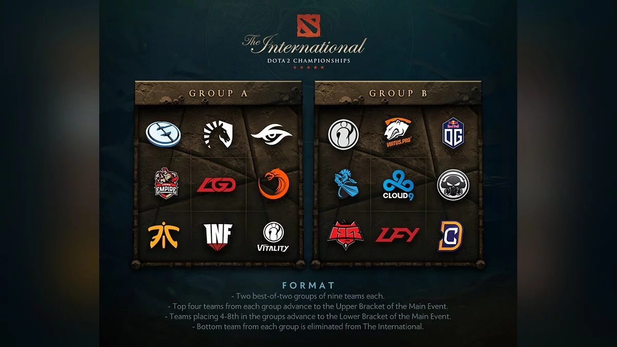 В группе А сойдутся между собой такие команды, как Evil Geniuses, Team Liquid, Team Secret, Team Empire, iG.Vitality, LGD, TNC, Fnatic, Infamous.