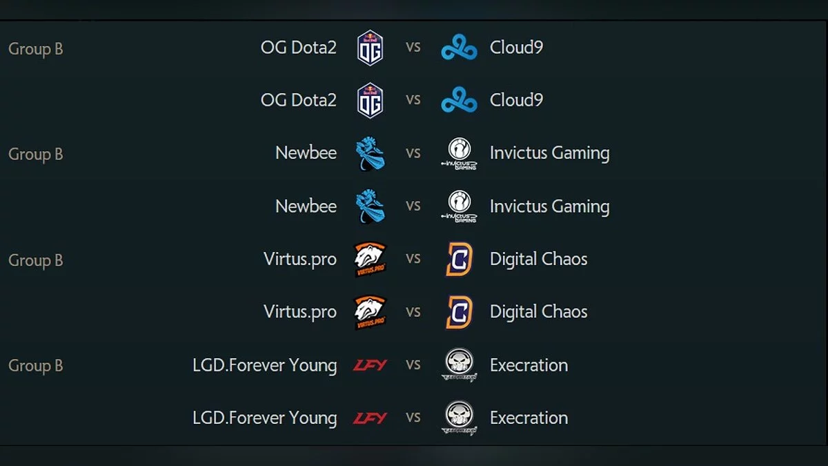 В группе B места будут распределяться между следующими коллективами: OG, Virtus.pro, Invictus Gaming, NewBee, HellRaisers, LGD.FY, Execration, Cloud9, Digital Chaos.