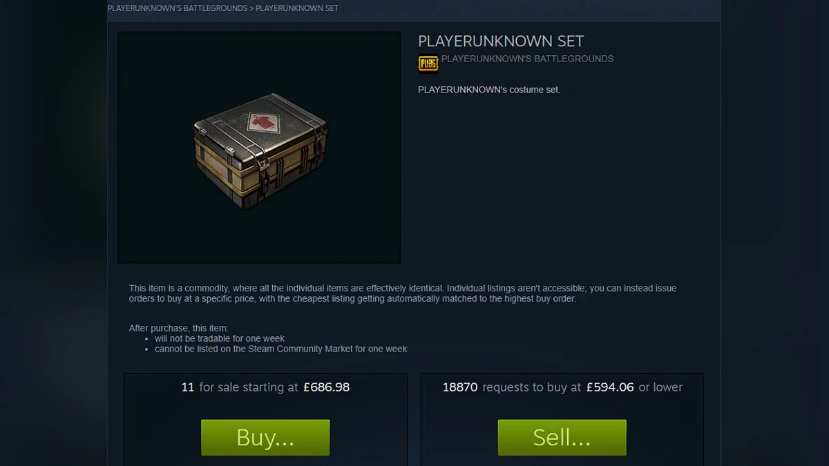 Самым дорогим предметом из Playerunknown's Battlegrounds, проданным в Steam, был ящик с костюмом. В него входит бандана, плащ, футболка, штаны и ботинки. Ящик был доступен только тем, кто предзаказал делюкс-издание или участвовал в альфа-тестировании. Сейчас данный ящик продается за 687 фунтов (почти 54 тысячи рублей), но некоторые смогли продать его за 780 фунтов (более 60 тысяч рублей).