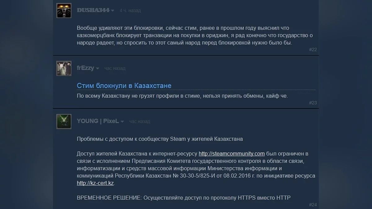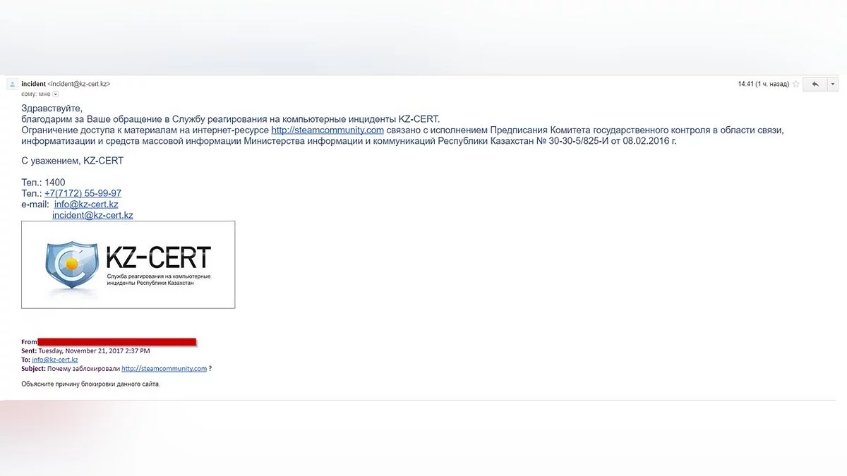 Центр сертификации KZ-CERT заявил, что «Сообщество Steam» (http://steamcommunity.com) было ограничено в Казахстане по решению Министерства информации и коммуникаций, которое было принято ещё в 2016 году.