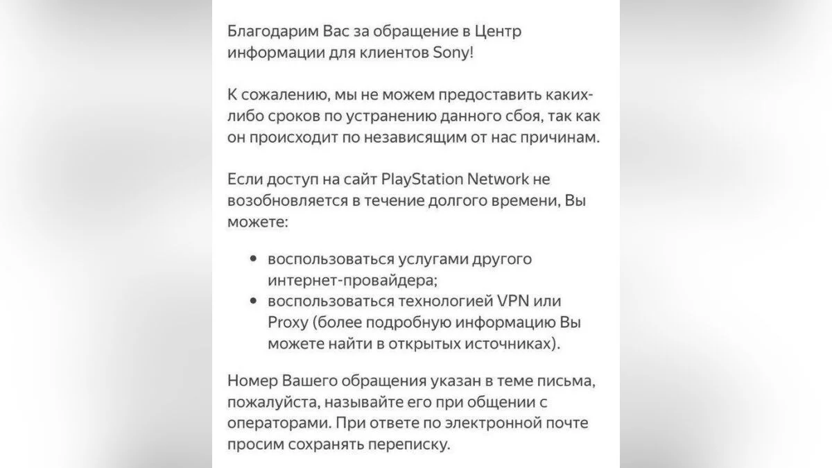 Именно поэтому единственным решением проблемы на сегодняшний день поддержка PSN видит либо использование прокси для обхода блокировки, либо вообще смена провайдера, что вряд ли сможет помочь большинству пользователей из России.