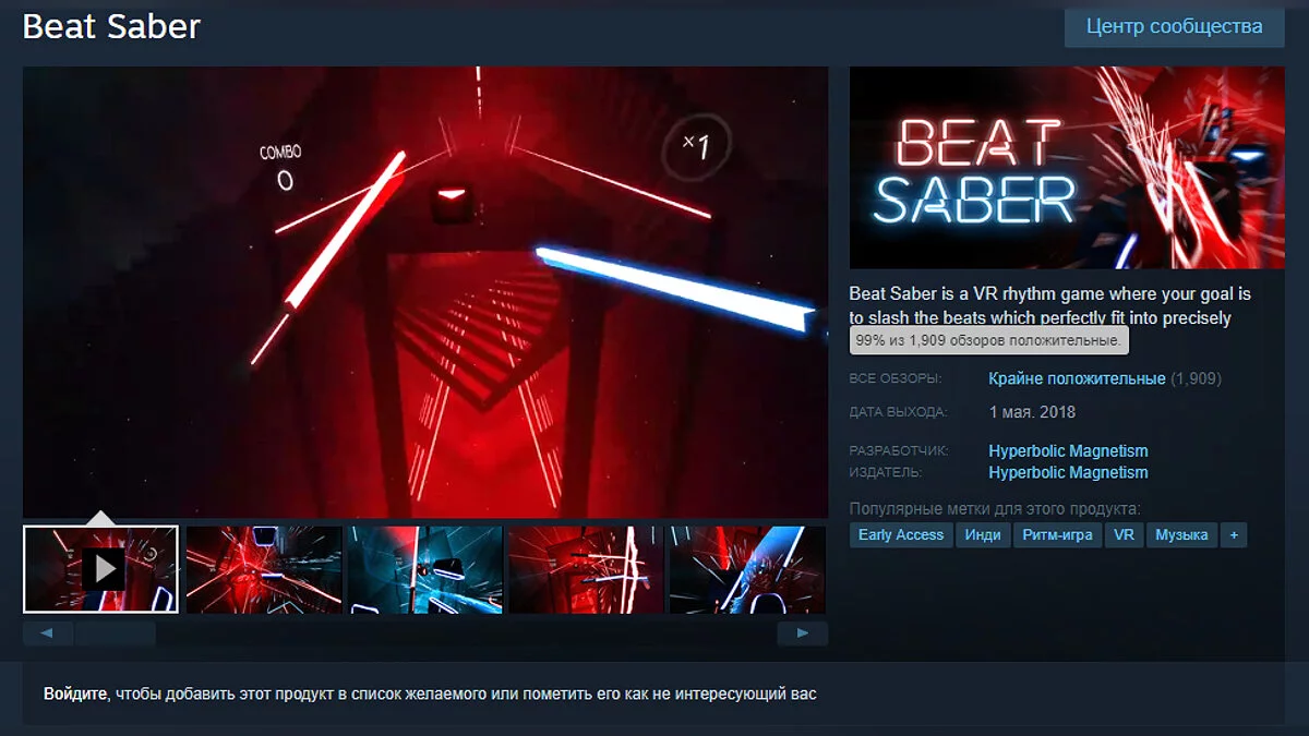Музыкальная VR-аркада Beat Saber, выполненная в стиле Guitar Hero, 1 мая вышла в раннем доступе Steam и всего за неделю смогла получить рекордно высокий рейтинг среди игр (за исключением дополнений). На момент написания новости игра имеет 99 % положительных отзывов в Steam (около 2 000 пользовательских обзоров).