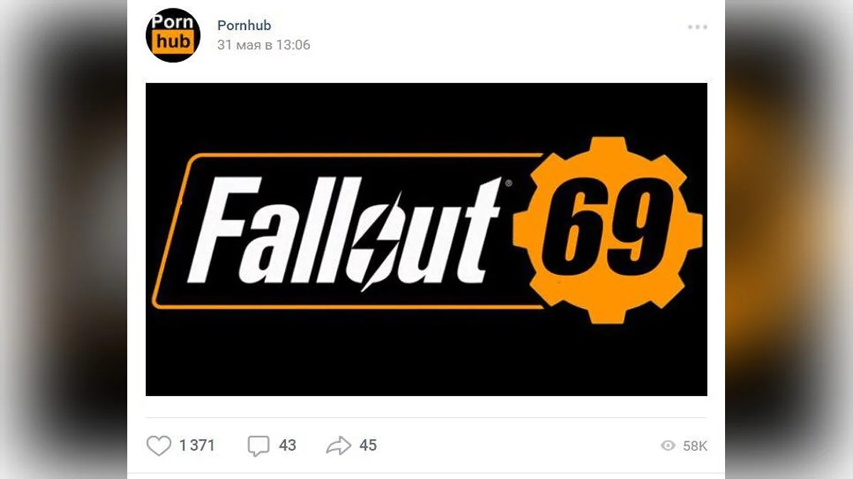 Все вы наверняка слышали об анонсе Fallout 76. Мы даже опубликовали статью с подробным разбором того, что известно об этом убежище. Намекая на актуальную тему последних дней, паблик Pornhub во ВКонтакте опубликовал следующее изображение: