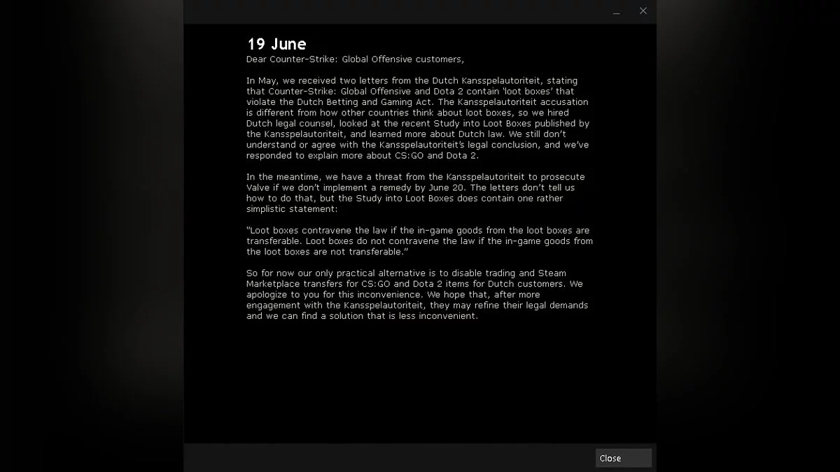 Valve утверждает, что данное решение было принято под давлением со стороны голландских законов, так как компания не смогла изменить дизайн игр, чтобы удовлетворять требованиям власти в данной стране. У компании было время до 20 июня, и все это время она вела переговоры с голландскими властями.