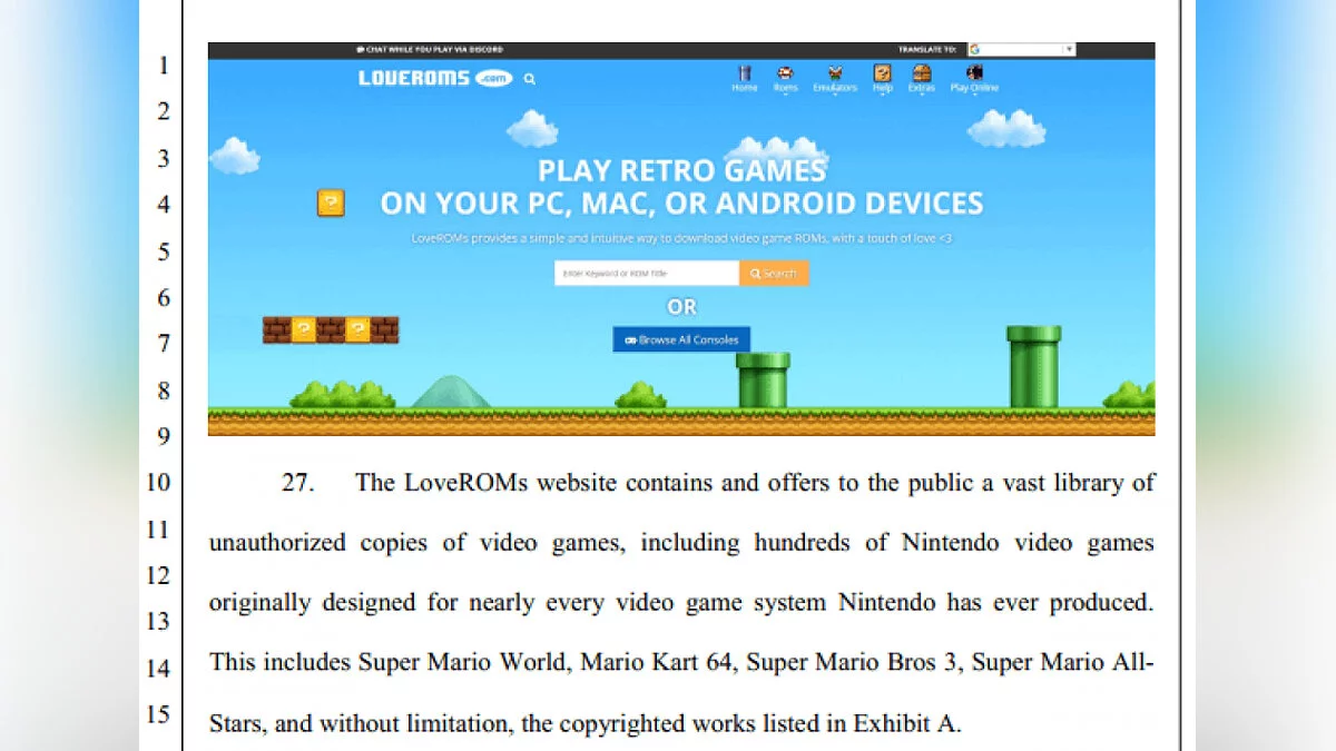 По словам Nintendo, сайты LoveROMs и LoveRETRO являются одними из самых известных распространителей пиратских игр, а компания столкнулась с миллионами долларов потенциального ущерба. В жалобе, поданной в федеральный суд в Аризоне, Nintendo отмечает многократное нарушение авторских прав и товарных знаков.