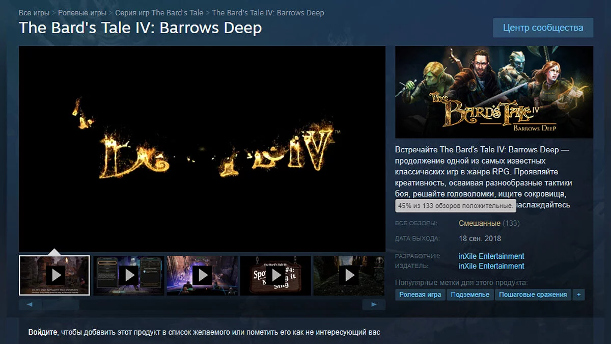 inXile Entertainment, создавшая Wasteland 2 и Torment: Tides of Numenera, выпустила на PC свою новую олдскульную RPG — The Bard's Tale 4: Barrows Deep, которая в первые часы после релиза получила свыше 50 % негативных отзывов от геймеров в Steam.