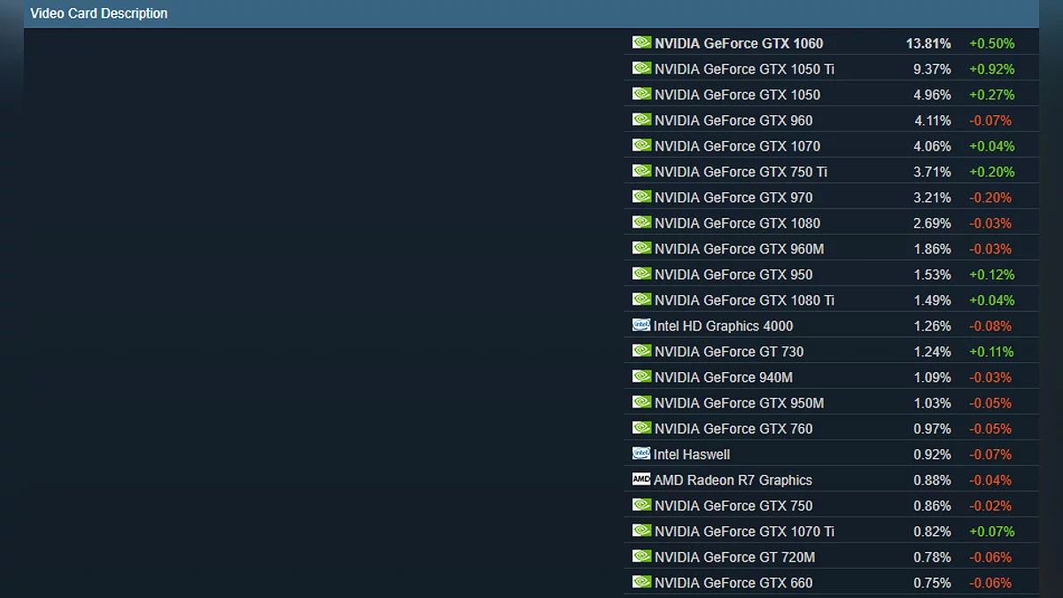 Что касается видеокарт, наиболее популярной является Nvidia GeForce GTX 1060 (около 14 %). На втором месте расположилась Nvidia GTX 1050Ti (9,37 %), а третье досталось GTX 1050 (4,96 %).