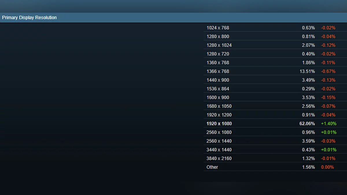 Оказалось, что всего 1,32 % играют в видеоигры в 4K (3840x2160). Наиболее популярным разрешением по-прежнему остается FullHD (1920x1080). На его долю приходится 62 % игроков. Остальная часть геймеров предпочитает HD и WXGA.