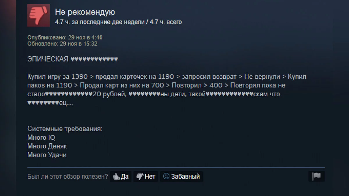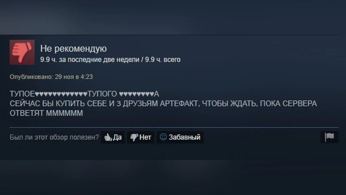 Карточную Artifact в некотором роде постигла судьба Fallout 76. Сразу после релиза на игру обрушилась критика со стороны геймеров. В Steam сейчас смешанные отзывы, а средний балл на Metacritic равняется 2,4. В основном проект ругают за слишком жесткую систему монетизации и невозможность получить новые карты без доната. Что именно пишут недовольные пользователи — смотрите в подборке реакций со Steam.