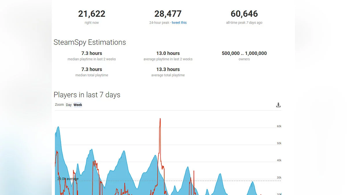 Когда игра вышла, в ней было зафиксировано около 60 000 геймеров. Сейчас ее онлайн составляет в два раза меньше — 28 000 игроков в пике и 20 000 в среднем.
