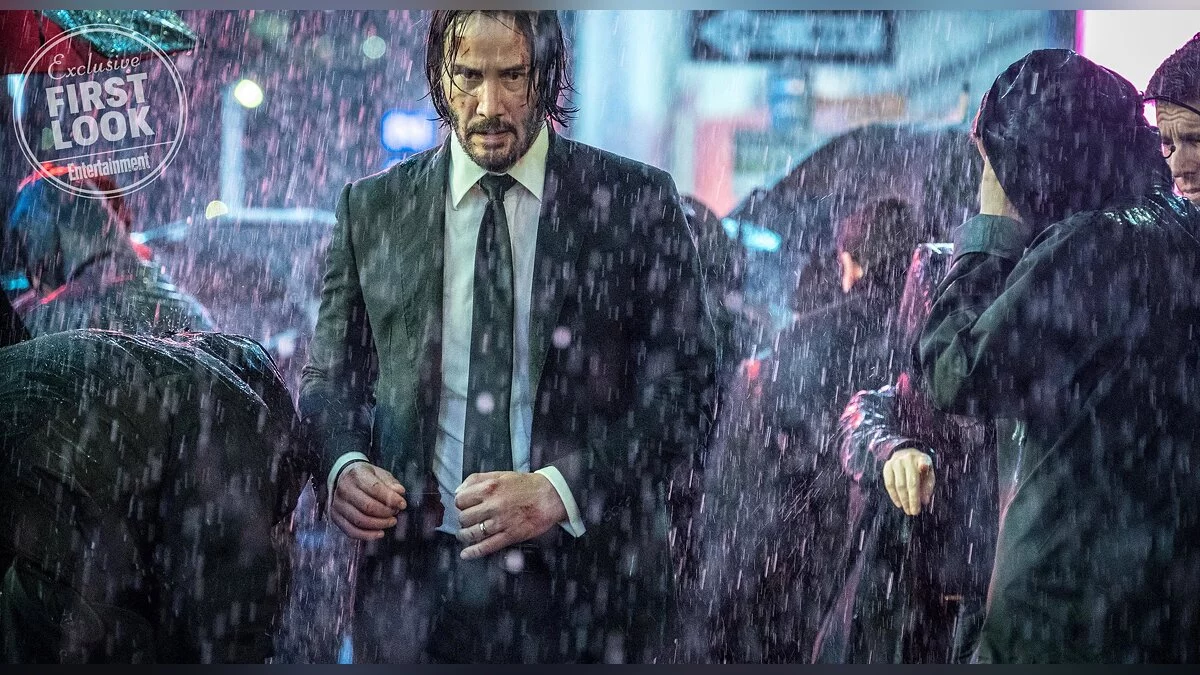 На первом изображении можно увидеть Джона Уика под дождем. Вероятно, он пытается скрыться от киллеров, желающих его убить.