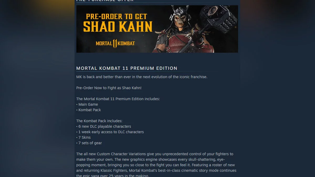 Стало известно, что за предзаказ расширенного издания можно получить саму игру, Шао Кана, который доступен при предзаказе любой версии, а также Kombat Pack, в который входят: