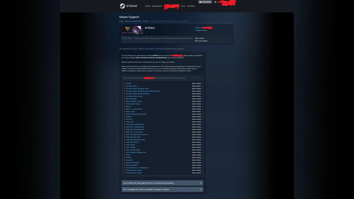 Зачем turtlebeng14 хочет убрать Artifact со своего аккаунта, не особо понятно. Любопытно другое. Steam не хочет удалять только одну игру — вместе с ней сервис предлагает забрать еще 36 игр от Valve.