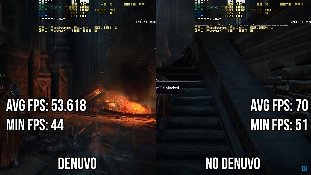 В Lords of the Fallen результаты оказались намного масштабнее: минимальное количество кадров в секунду в версии игры без Denuvo на 7 больше, чем с защитой (51 FPS против 43 FPS), а средняя производительность во время игры увеличивается на 16 FPS. Загрузка из меню тоже становится намного быстрее, а отклик главного героя на нажатия увеличивается в 4 раза.