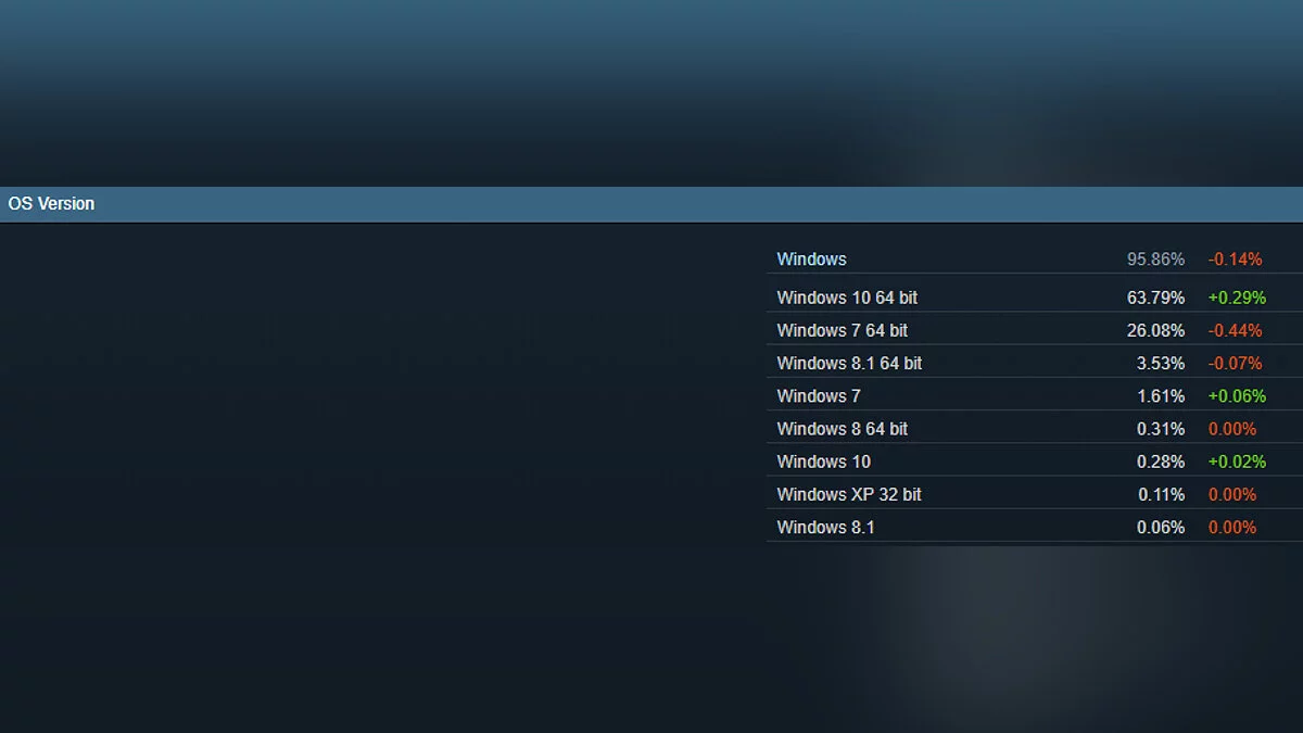 Что касается ОС, Windows 10 (x64) продолжает лидировать в Steam. Ее доля составляет 63,79 % против 26,08 % у Windows 7 (x64).