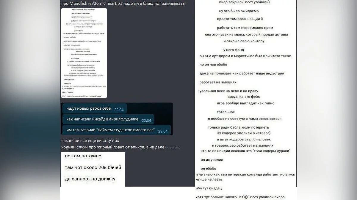 После показа нового геймплея Atomic Heart в сети появился скриншот, на котором можно увидеть много нелестных отзывов как о самой игре, так и о ее руководстве («Визуалка — это фейк. Игра выглядит как говно»). Автор телеграм-канала «Геймдев, который мы заслужили» пообщался с несколькими разработчиками (9 человек), которые рассказали ему «всю правду» о проекте и работе в Mundfish (российская компания). Имена разработчиков автор не называет.